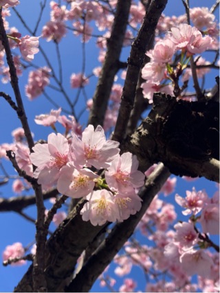河津桜だよ。先日の河津桜よりも淡いピンク。青空に映えてとてもきれい〜